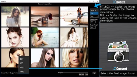 • Add one or multiple image. • Resize Images. • Fit Box and Fill images. • Easy to use Interface. • Compress Images. • Convert Images to JPG, JPEG, BMP, PNG and TIFF. • Save files. • Clear Files.