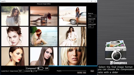 1. Click on the button [ Add Files ] in the bottom side or drag and drop to add one or multiple images and/or folders. 2. In the left side of the application on "Resize to" area, you can choose if you want use fit box on your image or fill. 3. Right above, choose the output width and height you want for your image. 4. In "Output format" area, select the format you want to save your images: JPG, JPEG, BMP, PNG and TIFF. 5. If you choose to compress your images, choose the compression rate you want between Max and Min and your images will be saved in JPG format. 6. Click on the button [ Begin ] to resize and save. 7. Click on the button [ Clear ] if you don’t wanna use the current images anymore.