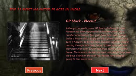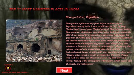 An entertaining app with horror specific content on "Top 11 most haunted places in India", haunted stories and true facts about the paranormal activities experienced there. Switch off your lights before running the app and read the content carefully, there's a twist of fun at the end.