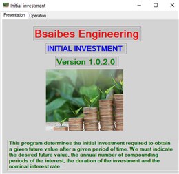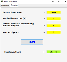 This program determines the initial investment required to obtain a given future value after a given period of time. We must indicate the desired future value, the annual number of compounding periods of the interest, the duration of the investment and the nominal interest rate.