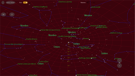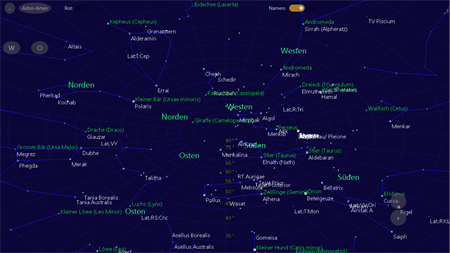 Allerdings zeigt sie den Sternenhimmel nicht aus der üblichen 3D-Perspektive des IO-Navigators, sondern als drehbare Sternkarte. Diese Sternkarten kennt man bereits seit vielen Jahren. Oft werden Sie bei einem Teleskop-Kauf beigelegt.