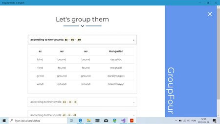 The starting page of my app shows the different groups of the irregular verbs the user can choose from. There are 6 groups altogether. By clicking on one of the groups, the user gets to the corresponding page containing the verbs of that group. The aim of this app is to show the learners of English that there is a certain regularity in the way the three forms of the irregular verbs are actually formed.