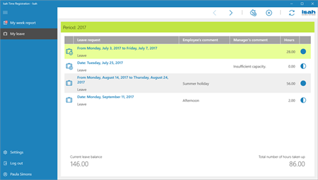 Isah Time Registration is a time registration app. It enables employees to register their weekly hours and to view their week reports. The hours entered provide an insight into the time spent across departments, projects and activities. The app also allows employees to submit leave requests to their managers. Leave requests are immediately displayed in week reports. Isah Time Registration gives managers a clear view of any outstanding week reports and leave requests. Once authorized by the appropriate manager, the week reports and leave requests are processed in Isah Expert.