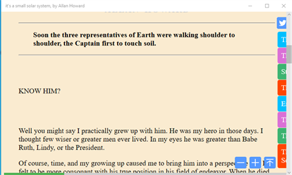 An ebook. A short story. A science fiction. Written by Allan Howard and first published in 1957. Soon the three representatives of Earth were walking shoulder to shoulder, the Captain first to touch soil.