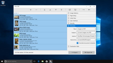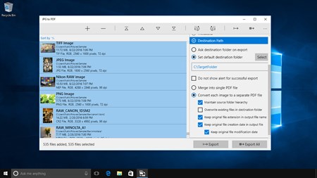JPG to PDF is an easy, intuitive and fastest way to batch export images and PDF files. In Addition, JPG to PDF offers to export multiple images into single PDF. Supports most of all popular image formats like JPG, JXR, PNG, PDF, BMP, TIFF, RAW types and many more.