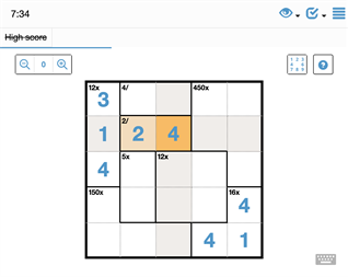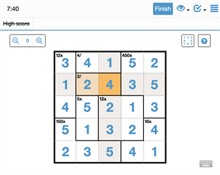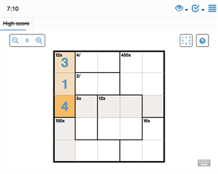Fill the cells so that every number is represented once in each row and column. The first cell of each outlined area contains a target sum and a mathematical operator. Combining all the numbers written within an area, using the mathematical operator, should produce the specified target sum.
