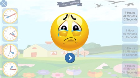 Kids can match time with clock and complete the level. There are four clocks given against its time and they need to match clock and its time correctly to go ahead. It shows green and red color line to identify correct and wrong answer respectively.