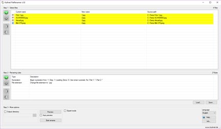 Features: • Integrated help • Preview • Many rename rules: ◦ Search and Replace ◦ Truncate ◦ Numeration (numbers, roman numerals, letters) ◦ Upper- and Lower-Case ◦ Edit file extensions ◦ Prefix / Suffix ◦ Insert and delete ◦ File size ◦ Date / Time ◦ MP3 ID3-Tag (v1 and v2) support ◦ WMA-Tag support ◦ Regular expression ◦ Exif support ◦ Vorbis comment support ◦ EML-Header support ◦ Hash (MD5, SHA-1, CRC32, SHA-256, SHA-384, SHA-512) ◦ UUID (GUID) • Save frequently used rules • Drag & Drop from Explorer • Unicode support • Integrated file preview to view images, text-, XPS- and RTF-documents • Exif-, ID3- and WMA-Tags, Vorbis comment and EML-Headers are shown in file preview • File list export to HTML, CSV and text • Some startup parameter