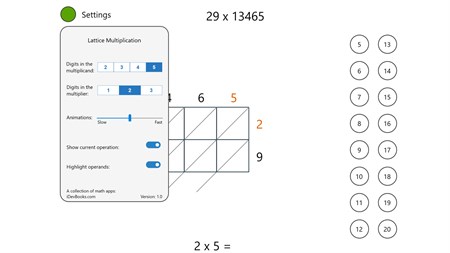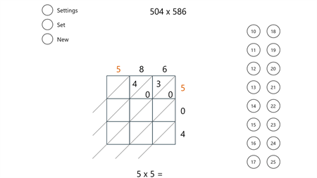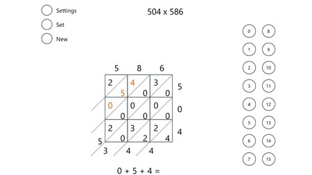This app can be used to teach and study the ancient lattice multiplication method. Solving lattice multiplication problems is also excellent times tables practice. The app is very easy to use and it has an intuitive interface with customizable colors and other settings. The user can solve custom and random multiplication problems with small and large numbers.