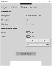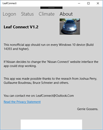 Some comments: • If logging on fails. Double check the “Username” and “Password” fields, they are both case sensitive and make sure you selected the right “Region”. • If logging on still fails. On the Nissan website you can find your mail address and a “user ID”. Try them both in the “User Name” field. • If you select “Save Settings” the app will logon automatically and forward you to the Status screen. • If you turn on the climate control with the app switch or timer and the climate control is turned off on timeout by the car itself or you manually turn off the climate control in the car. The app will keep telling you that the climate control is activated, even if you “Refresh status”. You have to put the app switch in the off position to correct this. The problem is that the car does not report the climate control status to the Nissan website. • Some commands only need communication with the Nissan website, other commands need communication with your car. This will take around 20 seconds. • You don’t have to wait for the status update from the car if you only want to switch on the Climate control. As soon as the switch gets enabled you can use it. • If the app detects that the last logon was more than 24 hours ago, it will logon again to prevent a communication session token timeout. • I tested the app with my Windows 10 Laptop, my Windows 10 Phone and my first generation Nissan Leaf. If you are having trouble with the app, let me know, maybe we can fix it. • You can contact me on LeafConnect@Outlook.Com