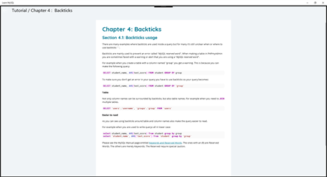 This app contains tutorials and reports for the all who want to learn MySQL. They can learn easily from this application.