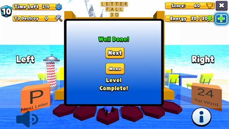 Where do I get energy from, I hear you ask, each letter has a points value, and by combining letters to create words you get a word score. Simply put we convert your word score into energy. Any energy not expended in the early levels is banked as gold to help you when the game gets really tough!