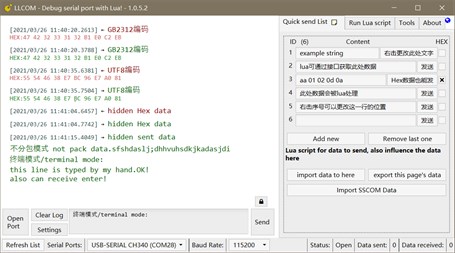 Open source serial debugger, with lua scripts. Basic functions of serial port debugger tools. The log is clear with two colors, display both HEX values and strings at same time. Auto save serial and lua script logs, with time stamp. Auto reconnect serial port after disconnected. Data you want to send can be processed with your own Lua scripts. Quick send bar on the right. Import and export quick send list data Lua scripts can be run independently with timer and co-process task features. socket test server controler, encoding tool etc.