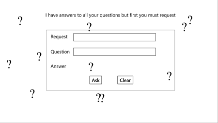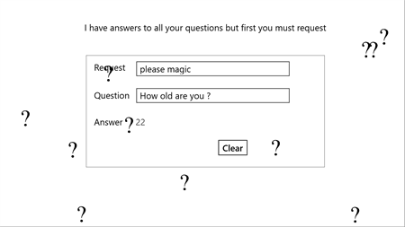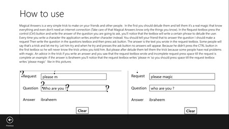 Magical Answers is a very simple trick to make on your friends and other people to answer all their questions. In the first you should delude them and tell them it’s a real magic that know everything and even don’t need an internet connection (Take care of that Magical Answers know only the things you know). You should tell your friends that to answer the question I should make a request. In the Request textbox press the control (Ctrl) button and write the answer of the question you are going to ask, you'll notice that the textbox will write a certain phrase character by character (The request) to delude the user. Then write the question in the questions textbox and then press ask button. The answer is the text you wrote in the request textbox. Some people will say that’s a trick and let me try. Let him try and when he try and presses the ask button no answers will appear. Because he didn’t press the CTRL button in the first textbox so he will never know the trick unless you told him. But please after delude them tell them the trick because some people have real problems with magic.