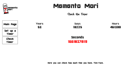 Imagine that you have an account in a bank and each midnight the bank transfers 86400$ to your account. You can spend the money from the account anywhere and any way you like. Each midnight all unspent money disappear and you receive another 86400$. What you will do? Obviously, you will try to spend everything within a day on something useful. But actually, when you were born you have received such account. And you have something much more useful than money on it. You have time. Time is most valuable asset in this world. You have limited amount of this asset since you were born. But usually people don't spent it deliberately. They waste there time on wars, bad movies, boring books, standing in traffic jams, they spend it on useless chatting. People usually don't fully understand how little time they have. So to remind you about the fact that one day you will run out of time, to remind you, that you should carefully spend your time on something really useful, this app was created. Click 'Set up a timer', input your birthday and how many years you expect you will live. Timer will approximately tell you, how much time is left for you. And every hour it will remind you that the clocks are running.