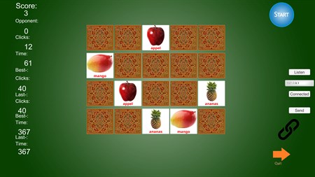 Find matching pairs of 'cards' with pictures of Fruit in as few clicks or time as possible (solo). Or Play Memory Game Fruit via the internet, LAN, (wireless) home network or (UTP) cable with a friend. Connect: First type both the IP address in the inputfield of your opponent during the Game. Hit the [Enter] key. Then use both [Listen] to be clicked once during the process of making the Connection on both ends of the Connection in the two instances of the Program (required). Let you and your friend make sure you both typed in the IP address of the Player on the other end across the network in an inputfield and press both [Connect], virtually at the same time together. Some Modem Port forwarding Settings may be necessary for you to make (both only once, yielding for all of my internet Games then), to let this program work. See the manual on my website: https://hannopondaag.github.io and also discover your IP address there via a Link. UPnP IGD should be on. And make the rule for portforwarding in your Modems (only one rule for all of my programs required thus). Mind your Local IP Address corresponds with your setting on your Modem when using the WAN at a home network situation and set portforwarding then to use port 1200 on your Modem. No ads.