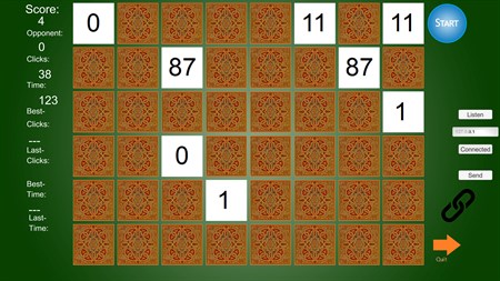 Find matching pairs of 'cards' with pictures of Numbers in as few clicks or time as possible (solo). Or Play Memory Game Numbers via the internet, LAN or (wireless) home network with a friend. Connect: First type both the IP address in the inputfield of your opponent during the Game.Then hit the [Enter] key. Then use both [Listen] to be clicked once during the process of making the Connection on both ends of the Connection in the two instances of the Program (required). Let you and your friend make sure you both typed in the IP address of the Player on the other end across the network in an inputfield and press both [Connect], virtually at the same time together. Some Modem Port forwarding Settings may be necessary for you to make (both only once, yielding for all of my internet Games then), to let this program work. See the manual on my website: https://hannopondaag.github.io and also discover your IP address there via a Link. UPnP IGD should be on. And make the rule for portforwarding in your Modems (only one rule for all of my programs required thus). Mind your Local IP Address corresponds with your setting on your Modem when using the WAN at a home network situation and set portforwarding then to use port 1200 on your Modem. No ads.