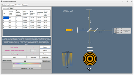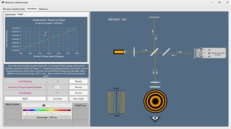 A Michelson interferometer is a tool used to produce interference between two beams of light by splitting a beam of monochromatic light into two equal amplitude beams. One beam hits a fixed mirror and the other hits a movable mirror giving different beam lengths which converge on a detector screen giving an interference pattern. Used for testing lenses and prisms, measuring the Index of Refraction, the determination of Wavelength of Monochromatic Light, and determining the Resolution of Spectral Lines, etc. This application simulates the interferometer to find the wavelength of monochromatic light. A valuable tool for colleges.