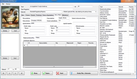 With this software You can : - create and use many databases in choosen locations, - search using wide criteria among program database records, search results are presented in intuitive interface, - enter original title of a movie and localised, - enter genre of a movie, - load and save cover of movie box, - enter starring and staff of any movie, - enter data about movie (date of production, premiere date, details of : audio codec, video codec, copy protection, picture encoding type, time, versions of lectors and subtitles, aspect ratio, countries of origin, places photographed), - describe data about owner of a movie copy and details of place where it was bought, - enter data about revievs of any movie in a table, - enter Your own score of any movie, - enter data about persons borrowing and their borrows in a table per each movie, - enter data about producers and distributors, - freedom in format of entered data, - export program database do MS Excell in *.csv format or to any other spread sheet, - print contents of a program database on printer,