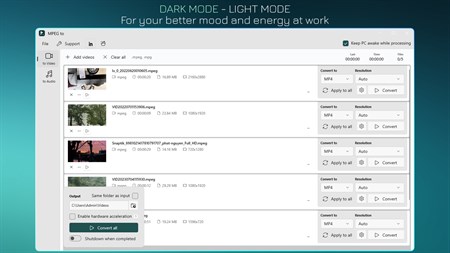 • Enable hardware acceleration to save time. • Auto shutdown when completed. • Save time with multiple files processed at once or focusing on a single video. • Keep PC awake while processing