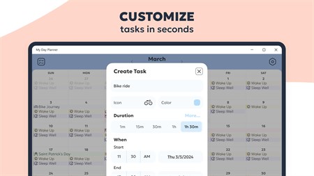 EASILY CREATE & EDIT TASKS - Enter task title, select an icon and color. - Set time and duration. - Create recurring tasks for activities that need to be done frequently.