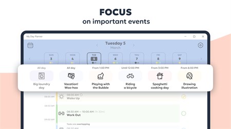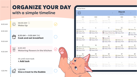 VISUALIZE YOUR DAILY ROUTINE - Get a detailed picture of your day and easily track your progress with a vertical timeline. - Visualize your tasks in a monthly calendar view.
