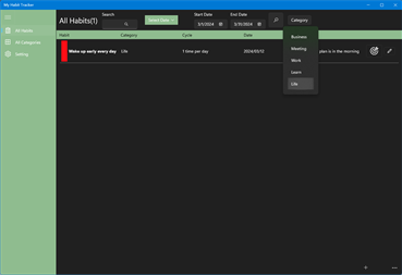 Different colors can be set for different habits. Organize your life, manage and keep track of your habits. There is no limit to the number.