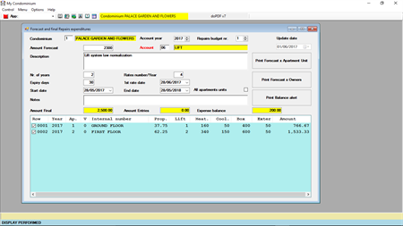 Allows you to manage one or more condominiums. The following functions are included: - Administrator's and condominium's registry cards - Registry of property owners and tenants - Registry records of apartments units of each condo - Maintenance expense budgets, prints and expenses alerts - Payments and incomes - Condominium charges and alerts - Budget of repairs expenses, prints and alerts - Expenses control and list