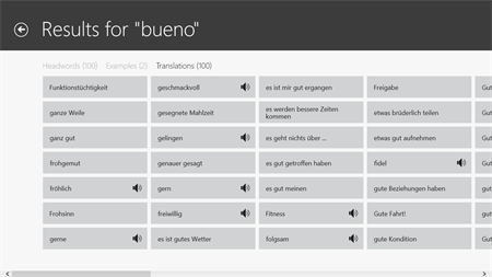 • Audio pronunciations of German and Spanish words recorded by native speakers to master your spoken language skills. • Favorite articles to quickly access and revise frequently searched words. • Search history. While you are using the dictionary, it saves all looked up and viewed words/phrases in the history.