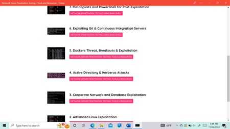 1. Hacking concepts and phases 2. Passive reconnaissance & Active reconnaissance 3. Port scanning & Network scanning 4. Vulnerability scanning & Maintaining access 5. White box pentesting, Black box pentesting & Gray box pentesting 6. Red teaming, Blue teaming & Purple teaming 7. Using theHarvester tool for Open Source intelligence gathering. 8. Installing Nexpose for Modern Server Penetration Testing 9. Advanced Linux Exploitation 10. Linux attack vectors - Network, Host & Application Threats 11. Linux enumeration with LinEnum 12. OS detection with Nmap 13. Exploiting Linux services - X11 service, Wildcards, SUID abuse & Linux kernel exploitation 14. Linux privilege checker 15. Linux kernel exploitation 16. UserLand versus kernel land 17. Linux kernel vulnerabilities 18. Memory corruption & Kernel Stack vulnerabilities 19. Linux Exploit Suggester 20. Linux return oriented programming 21. Linux hardening 22. Corporate Network and Database Exploitation 23. Insecure SNMP configuration 24. Database server exploitations 25. TCP communication 26. ICMP scanning 27. SSDP scanning 28. UDP Scanning 29. Host-based & Network-based Intrusion detection systems 30. Machine learning for intrusion detection 31. Insecure SNMP configuration 32. DNS security 33. DNS attacks 34. Sniffing attacks - ARP Poisoning & MAC spoofing 35. WireShark & DDoS attacks - SYN flooding, ICMP flood attack 36. Defending against DDoS attacks 37. Software-Defined Network penetration testing 38. SDN attacks & SDNs penetration testing 39. Attacks on database servers - Excessive privileges, SQL injection, Weak authentication & Exposure of backup data 40. Active Directory and Kerberos - Active Directory attacks 41. Lightweight Directory Access Protocol 42. PowerShell and Active Directory 43. Using PowerView for Active Directory Attack 44. Dumping all domain credentials with Mimikatz 45. Dumping LSASS memory with Task Manager (get domain admin credentials) 46. Dumping Active Directory domain credentials from an NTDS.dit file 47. Docker & Kernel Exploitation 48. Building a penetration testing laboratory 49. Exploiting Git and Continuous Integration Servers 50. Installing Jenkins 51. Continuous integration attacks 52. Continuous integration server penetration testing 53. Continuous security with Zed Attack Proxy 54. Metasploit and PowerShell for Post-Exploitation 55. Nishang PowerShell for penetration testing and offensive security 56. Dissecting Metasploit Framework 57. Bypassing antivirus with the Veil-Framework 58. Writing your own Metasploit module 59. Weaponized PowerShell with Metasploit 60. PowerSploit - AntivirusBypass, Exfiltration, Persistence, PowerUp, PowerView 61. Defending against PowerShell attacks 62. VLAN Exploitation 63. MAC attack 64. DHCP attacks 65. DHCP starvation 66. Rogue DHCP server 67. VLAN hopping attacks 68. Spanning Tree Protocol attacks 69. VoIP Exploitation 70. RTP/RTCP 71. Secure Real-time Transport Protocol 72. Eavesdropping 73. SIP registration hijacking 74. Spam over Internet Telephony 75. VoLTE attacks 76. SiGploit – Telecom Signaling Exploitation Framework 77. Insecure VPN Exploitation 78. Cryptographic attacks - Brute force attack (BFA) & Dictionary attack, Birthday attack, 79. Routing and Router Vulnerabilities 80. Exploiting routing protocols 81. OSPF attacks 82. MaxAge LSAs, Seq++ attack, Persistent poisoning & Internet of Things Exploitation