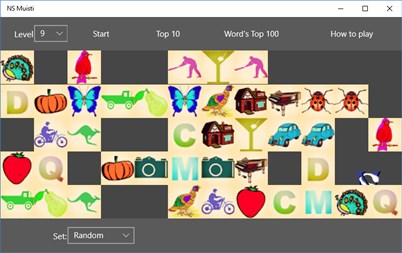 NS Muisti is a game where player tries to find two identical images. Player can choose images from three sets. Images, Silhouettes, Letters and randomly from all three sets. Player get the better score the faster finds the pairs of images and the less needs screen taps.