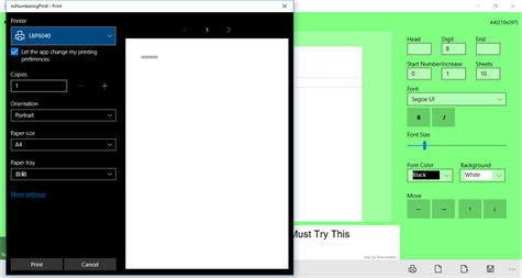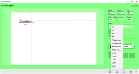 -Number string on canvas : You can move the mouse or touch , move button on Option Pad. -Option Pad : Word , Digit , End , Start Number , Increase , Sheets , Font ... -Menu : Save As , Open , Page , Print ...