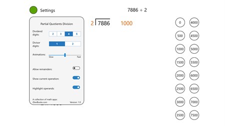 This math app can be used to teach and study the partial quotients division method. The app is easy to use and it has an intuitive interactive interface with customizable colors and other settings. The user can solve random and custom division problems.