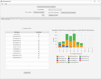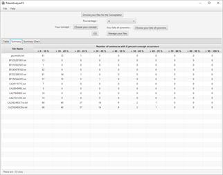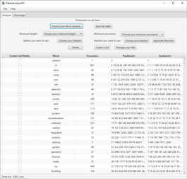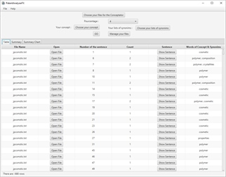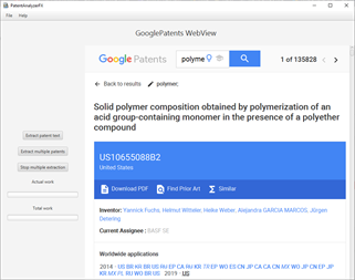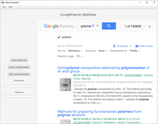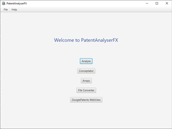 PatentAnalyserFX is an application made for patent analysis. Thanks to this application, you will be able to find the concepts (subjects) in patents, verify the presence of a concept in whole sets of patents and download rapidly a large number of patents from GooglePatents.