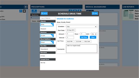 - Nurse/Doctor can add various medicines data which they prescribes to their patients. - Nurse/Doctor can add Patient information (Name, Gender, Birth Date, Patient current condition) - Nurse/Doctor can assign medicines to patient with its dosage-schedule. - Nurse/Doctor can track patient's vital sign information. - Nurse/Doctor can track patient's pain information. - Nurse/Doctor can track patient's blood sugar information. - Nurse/Doctor can add appointment details in application with reminder. - Nurse/Doctor can track patient's lab report details, diagnostic details and medical background details. - OneDrive integration for importing and exporting medicine data to/from Cloud service.