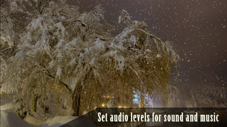 Settings allow you to adjust size and frequency of snow, audio and scenes, there is also a sleep timer.