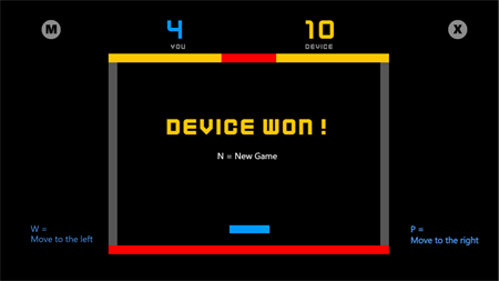 Press the spacebar to start/continue the game. At the start a ball is thrown into the field. Try to shoot the ball into the top red zone to score a point. Always defend your own red zone! When the play ball crosses your red zone, the device scores a point. Whoever gets 10 points first wins.