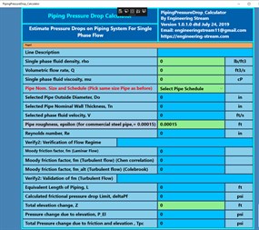 PipingPressureDropCalculator is a software program that can be used to estimate the pressure drop in a piping system. The fluid inside the piping needs to be a single-phase liquid or vapor/gas.