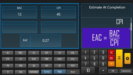 Project Management Calculator is a valuable tool added to this resource app. It can be used to remember formulae and their working relationship as well as on projects. Each formula when selected have the option to display details about it.