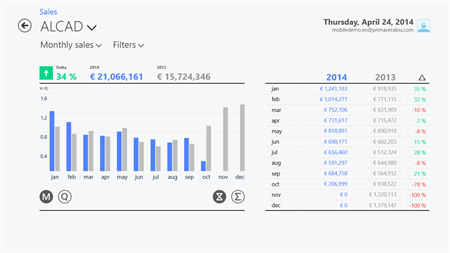 Thanks to its integration with the PRIMAVERA ERP, the Sales module makes it possible to view the sales information of a given company in graphic or table format, organized by timeframe, region, client or sales person. Within the timeframe analysis, the data can be visualized per week, month, and quarter or with accumulated values since the beginning of the year, always with a comparison to the same period of the previous year.