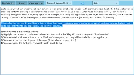 Several features are really nice to have: 1) Highlight the content you only want to hear, and then notice the "Play All" button changes to "Play Selection" 2) You can install additional Voices on your Windows 10 computer, and they will be available in this application 3) You can control the rate of speed of the voice (slow it down; or speed it up) 4) You can change the font size. From really-really small, to big.