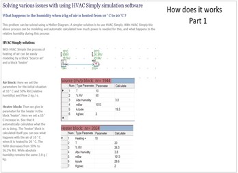 Psychrometric Hvac Simulation Pro is an easy to use Psychrometric Chart with which you can make calculations of air treatment processes. Also Calculator and Hvac Simply Lite. 20 Samples of Models Simulation Hvac Installations : Crossflow Bath Heating Solar saving Heatpump Air/Water '' '' Water/Water '' '' Air/Air Twincoil Swimming Pool Heatwheel Heatpump COP Calculation Waterfall Weather Hospital Dry Wheel Boiler Profit/Condensation P Controller