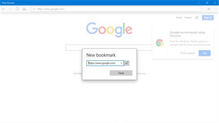 Pulse Browser is a simple web browser with forward back refresh home buttons URL search bar History Bookmarks and can change the background color dark or light.