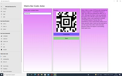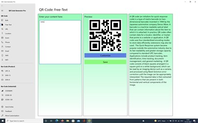 QR Code Generator enables you to generate and customize personalized QR-Codes, Linear barcodes and Matrix barcodes. The following barcode formats are available: Linear barcodes (1D)-Product: UPC-A, EAN-13 and EAN-8. Linear barcodes (1D)-Industrial: CODABAR, CODE-39, CODE-128, ITF, MSI and PLESSEY. Matrix Barcodes (2D): AZTEC, DataMatrix and PDF-417. QR-Codes: >Bulk-QR: Converts each line into a QR-Code. >Free-Text: Make QR-Codes which has simple text. >WiFi: Make QR-Codes which has a WiFi Details attached to it. >URL/Website: Make QR-Codes which contain URL of a website. >Geo-Location: Make QR-Codes which has a geo-location attached to it. >Event:Make QR-Codes which has a planned event attached to it. >Contact: Make QR-Codes which contain all contact information of a individual/company. >Phone-Number: Make QR-Codes which contain a contact number. >SMS: Make QR-Codes which has message and a phone number. >Email: Make QR-Codes which has email address attached to it. The app also provides features for the user to customize the QR-Code/BarCodes generated, either by color or size.