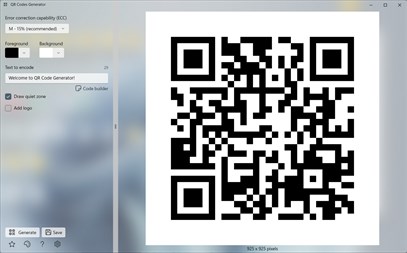 Save QR code: - Save QR code in JPEG, JPG, PNG, GIF, TIFF, BMP, JPEG-XR, HEIF (Windows 11), HEIC (Windows 11) picture formats. - Visually change QR code size and save in desired resolution.