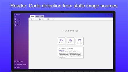 In addition to the scanner via the camera, saved images can also be read using the 'Reader'. Various options are available for this purpose: - Open image file - Paste image or image file from clipboard - Screen Snip - Drag & Drop of image files and images (also e.g. from the browser)