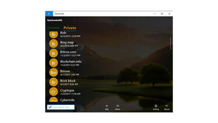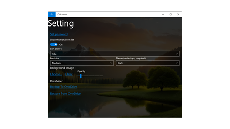 Quicknote is a small program to store personal information,notes. It is simple and very easy to use Features: - Common and Private notes - Secure note:Private notes protected by password - Search notes - Sort notes - Share notes - Reminder - Backup and restore data - Change font size - Change background Image - Attack Image - Note reader - Enter text by speaking - Show/Hide thumbnail on list - Moving notes between Common and Private