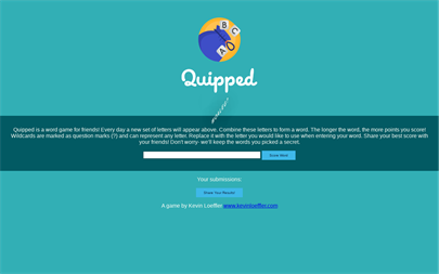 Every day Quipped challenges you and your friends to produce a word with the highest score from today's puzzle! Each morning a unique set of letters is generated – the same for every player in the world. The goal is to create the longest word or words that involve the most unique letters to score the most points. Vowels, for example, are worth a single point while more exotic letters like Q and Z are worth the maximum of 10. You get as many attempts as you want, and can easily share your score with friends and social media. Social sharing is easy and hides the actual letters used by the player, while showing their scores.