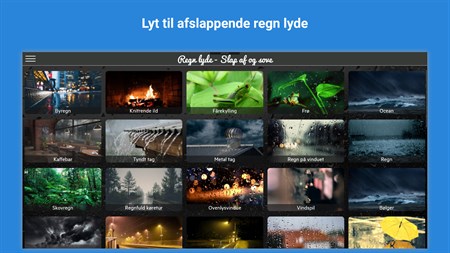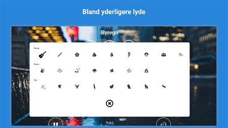 - 65+ perfekt loopede regnlyde - Mulighed for at bruge applikationen sammen med andre applikationer - Timer til selvlukning af applikationen
