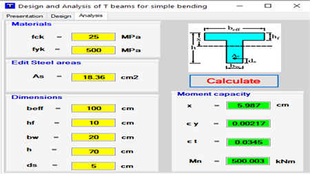 This application is intended to calculate the tension steel and to determine the moment capacity in T beams subjected to simple bending according to Eurocode2
